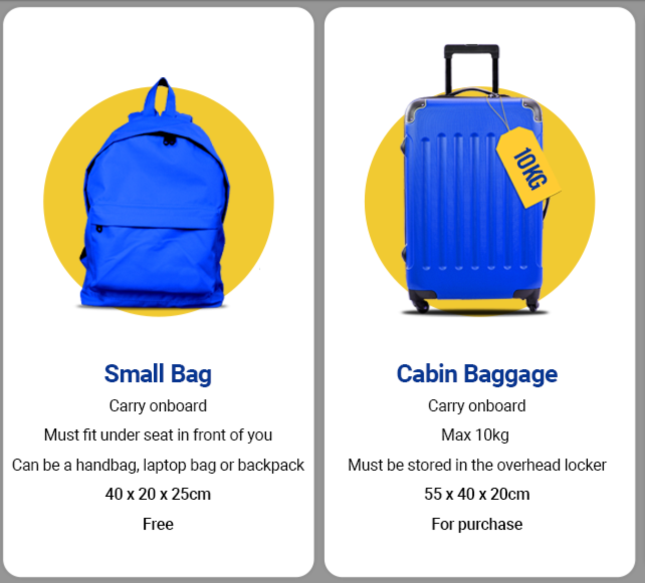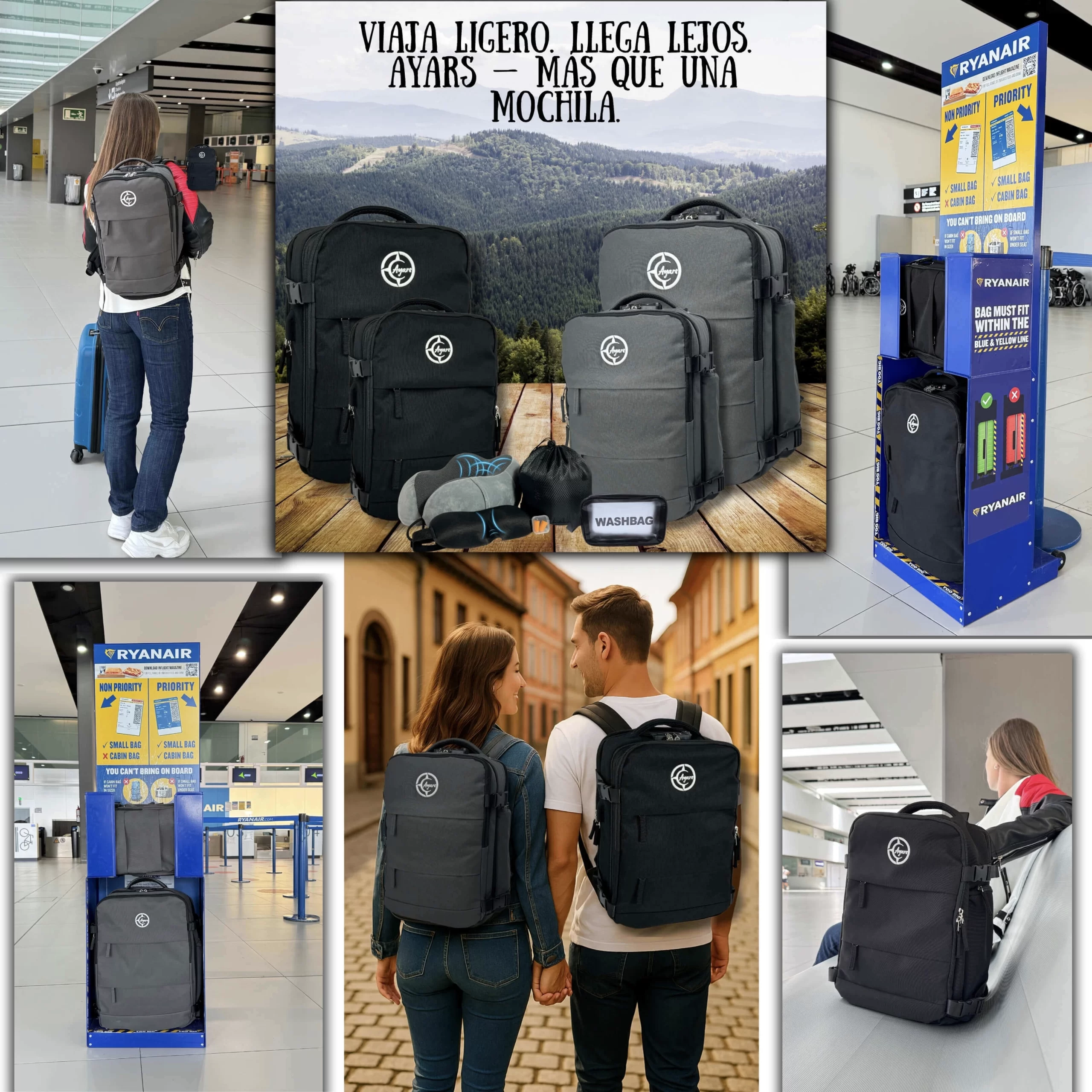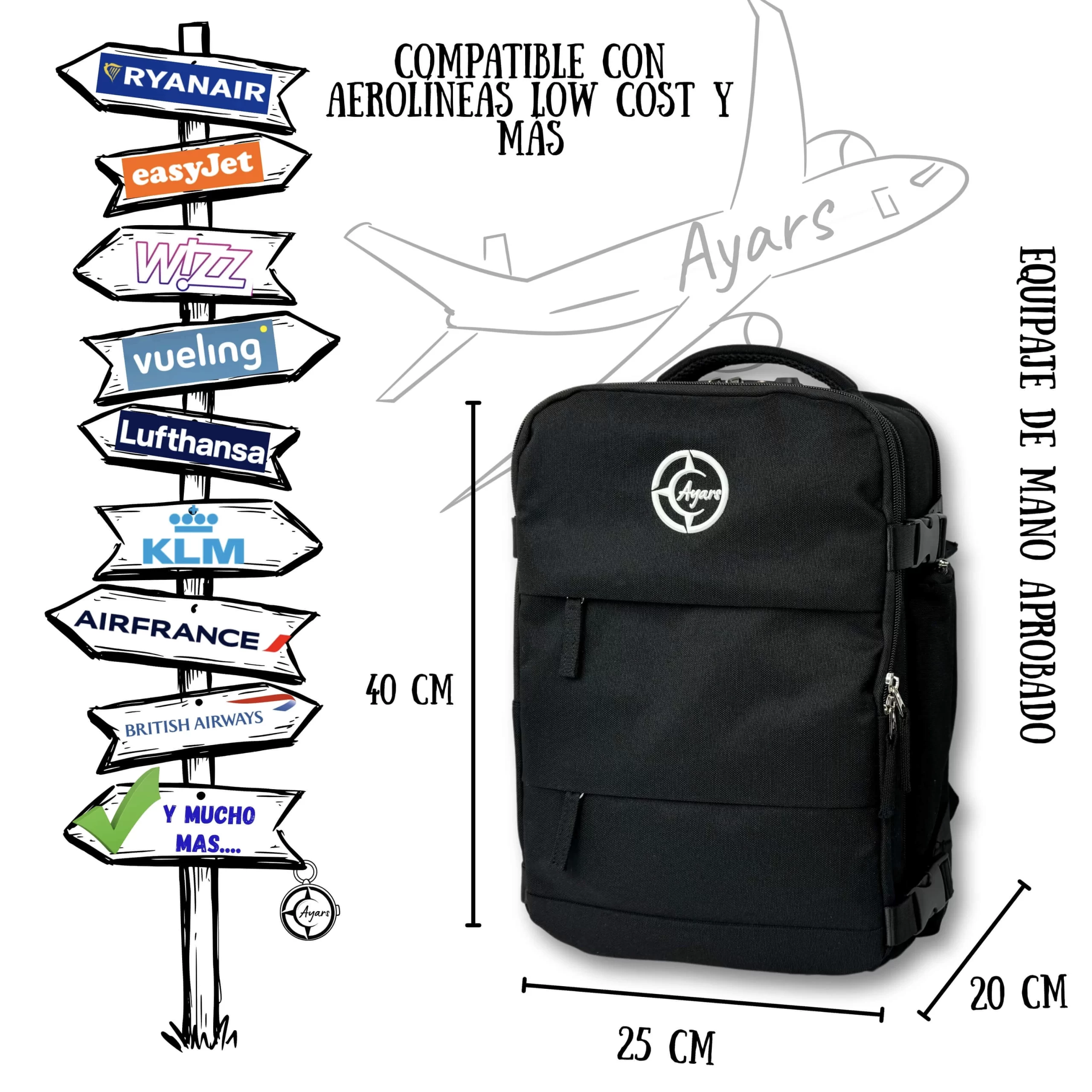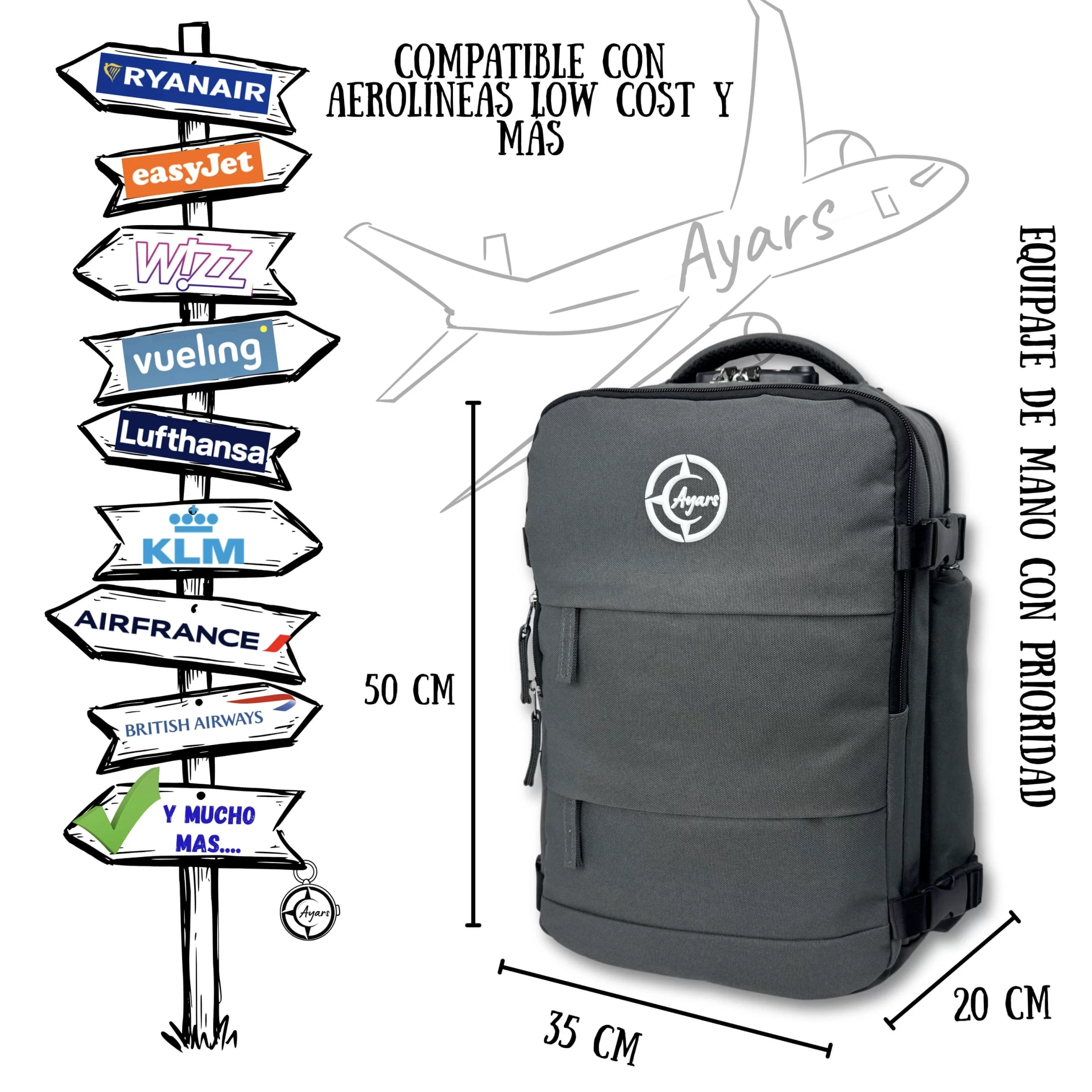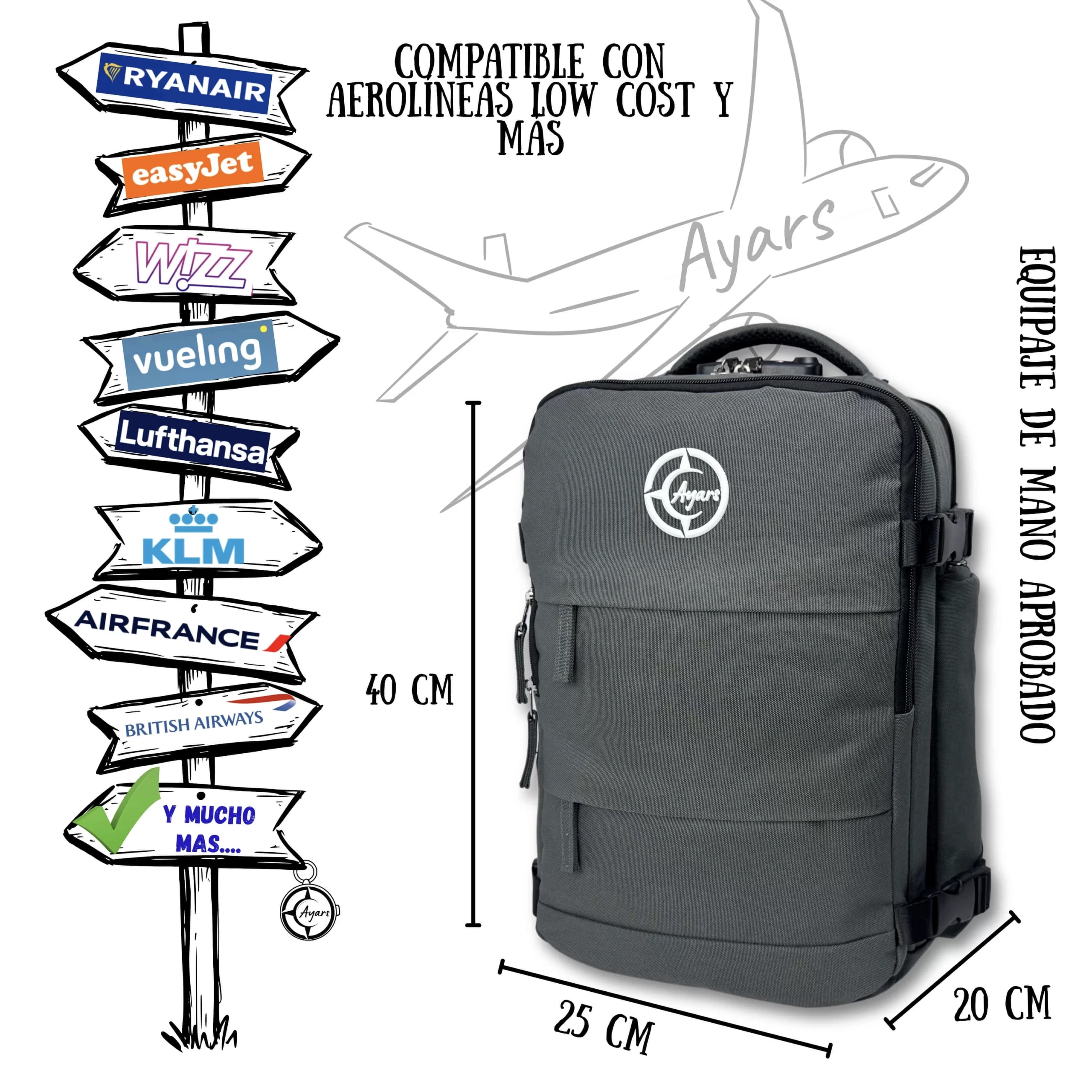 40×25×20 cm ir 50×35×20 cm modeliai telpa pagal KLM, Lufthansa, Air France, easyJet bei kitų populiarių oro linijų reikalavimus.